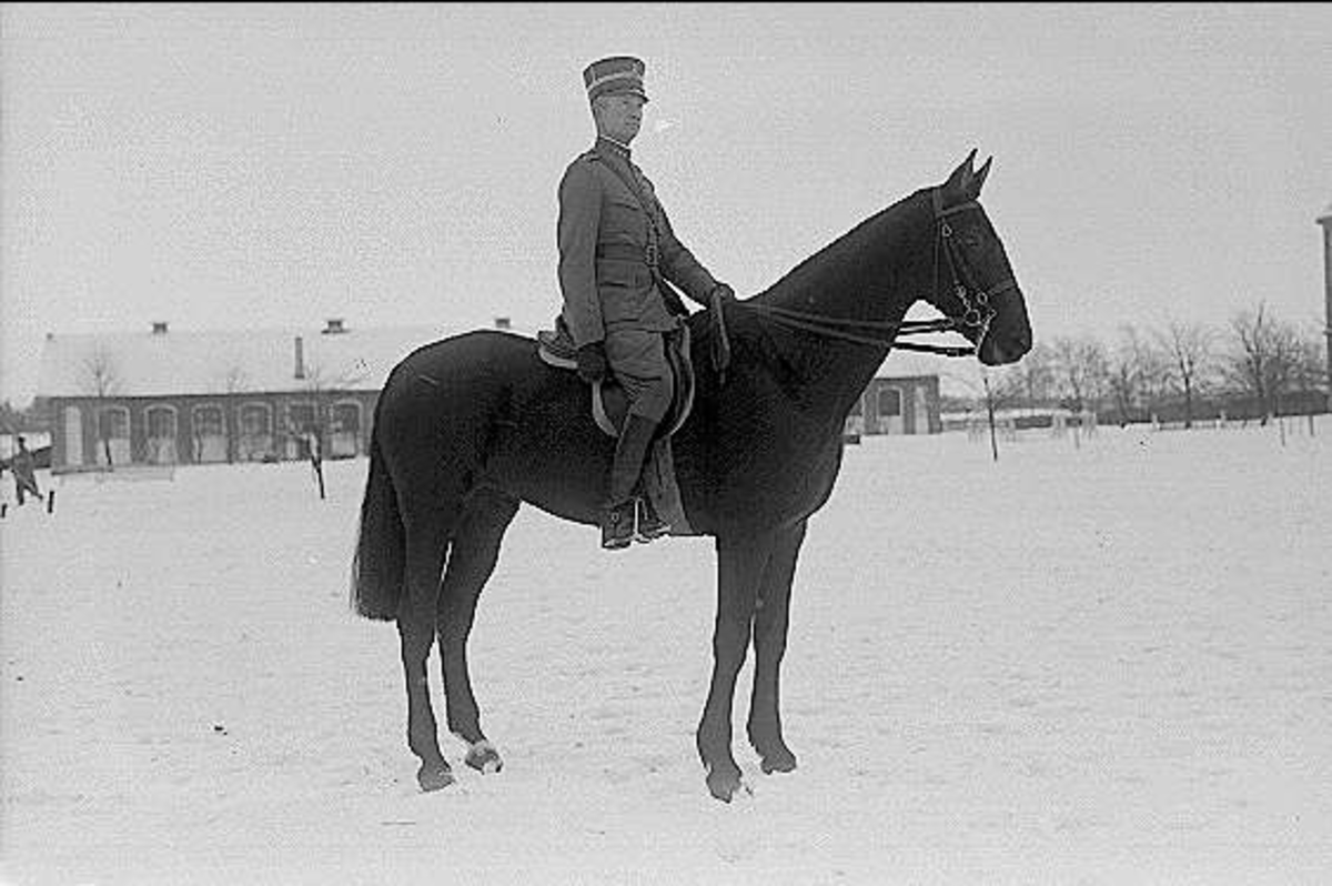 Ryttmästare Rolf Örn med en av sina duktiga prishoppningshästar på kaserngården med ridhuset i bakgrunden. Rolf Örn var en av K 3:s absolut skickligaste prishoppare.