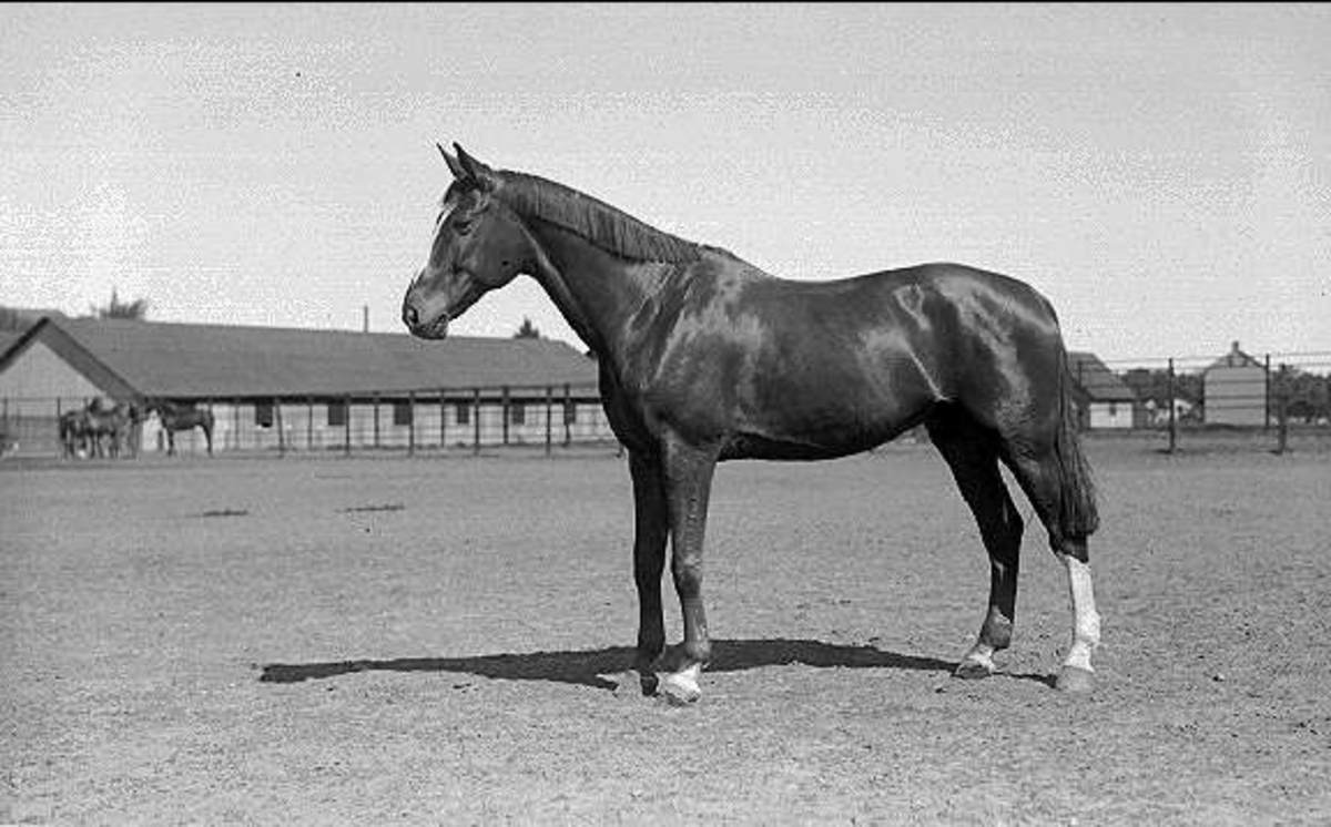 Stamhäst utanför järnpaddocken öster om K 3 ridhus.