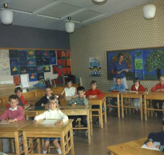 Titel: Interiör från en skolsal i Södra Skogens skola 1965. Lärare: Gertrud Dahl. Endast neg finns.