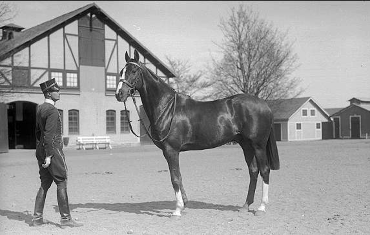 Löjtn. H Strömfelt K 3 med sin tjänstehäst på kaserngården söder 5.skv stall.