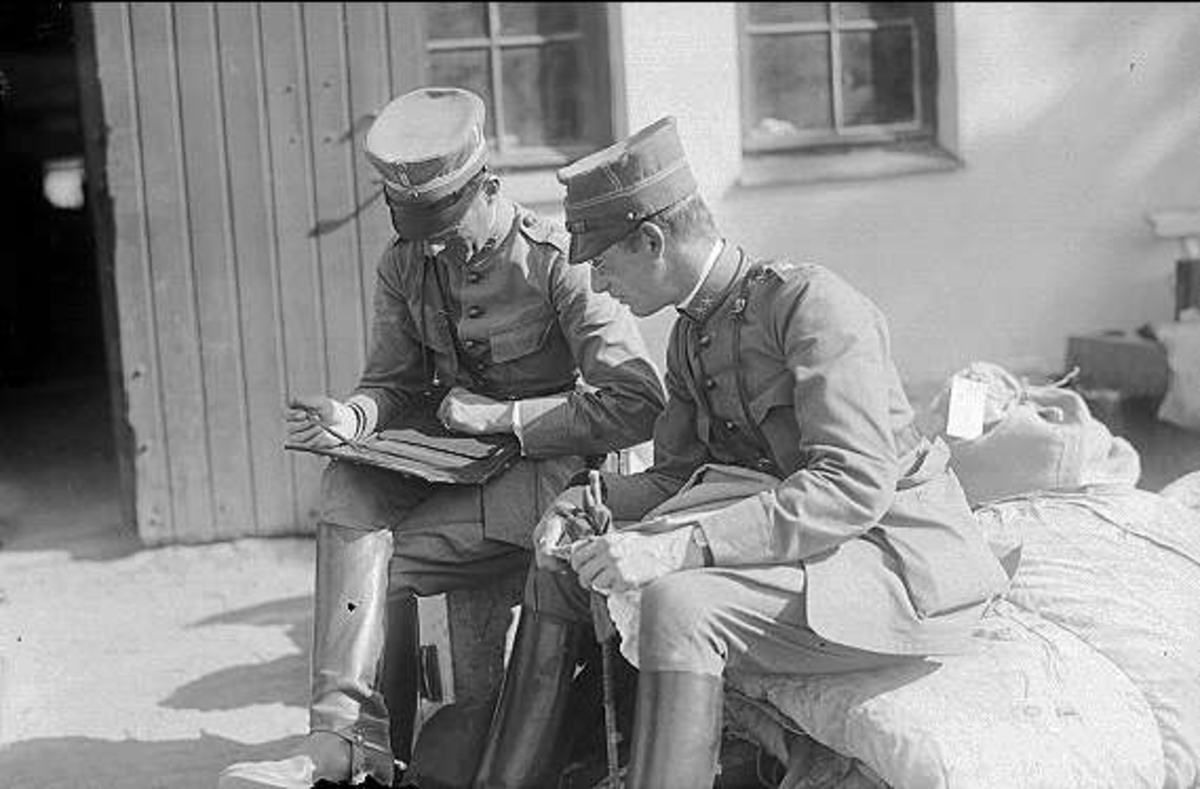 Chefen för livskvadron ryttmästare Rolf Örn tillsammans med en löjtnant utanför skvadronsstallet gör en sista planläggning av dagens övning.