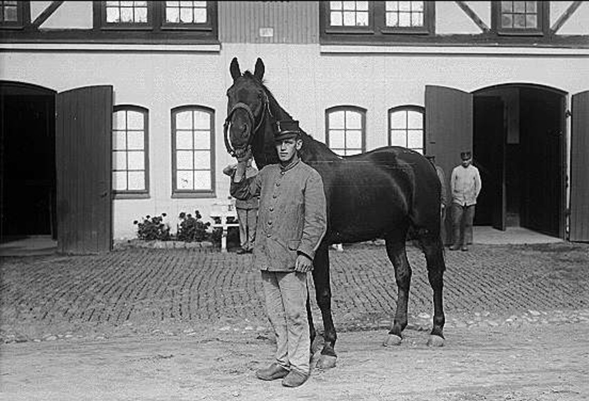 Livhusar med tilldelad stamhäst ur 4.skvadronen framför 4.skvadronens stall.