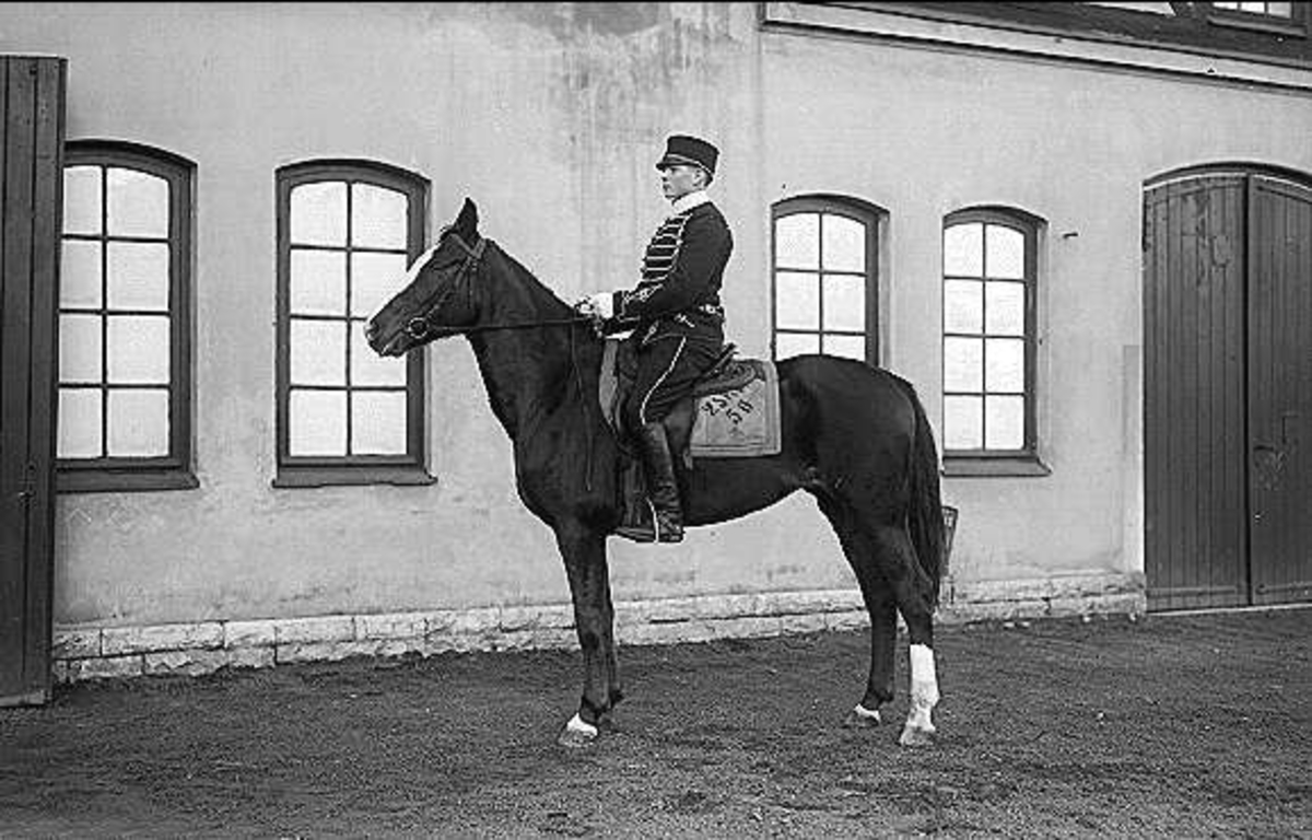Livhusar, troligen från en skvadrons volontärskola, fotograferad till häst framför skvadronens stall.