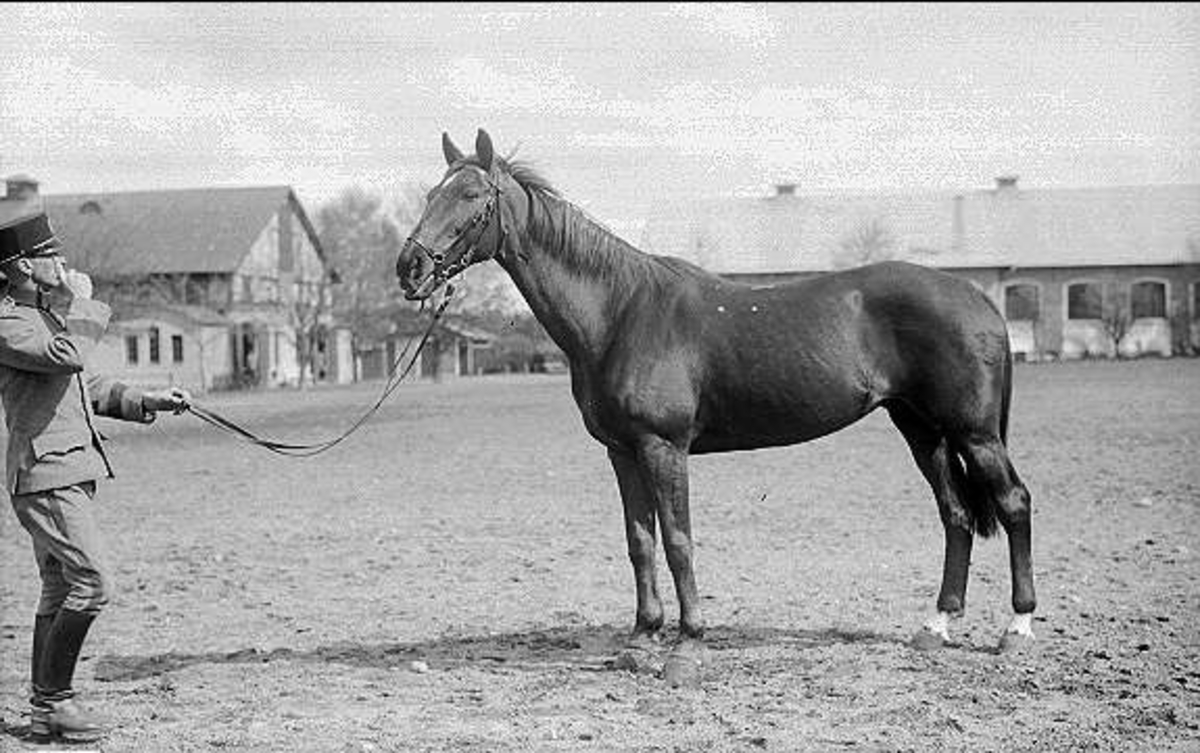 Livhusar med tilldelad stamhäst ur 4.skvadronen på kaserngården söder om skvadronstallarna. Ridhuset och 5.skvadronens stall i bakgrunden.