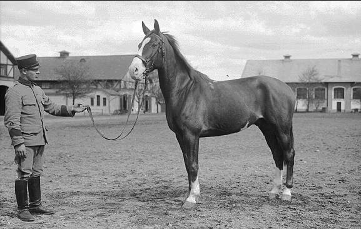 Livhusar med tilldelad stamhäst ur 4.skvadronen på kaserngården söder om skvadronstallarna. Ridhuset, 5.skvadronens stall och del av 4.skvadronens stall i bakgrunden.