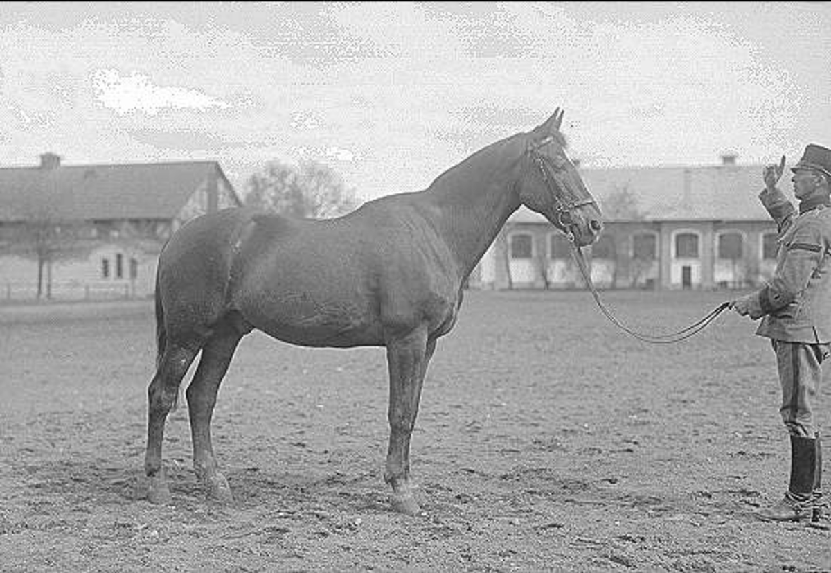 Livhusar med tilldelad stamhäst ur 4.skvadronen på kaserngården söder om skvadronstallarna. Ridhuset, 5.skvadronens stall i bakgrunden.