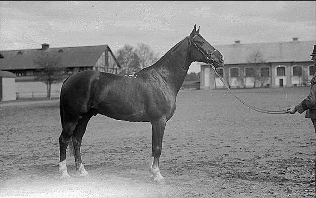 Livhusar med tilldelad stamhäst ur 4.skvadronen på kaserngården söder om skvadronstallarna. Ridhuset, 5.skvadronens stall i bakgrunden.