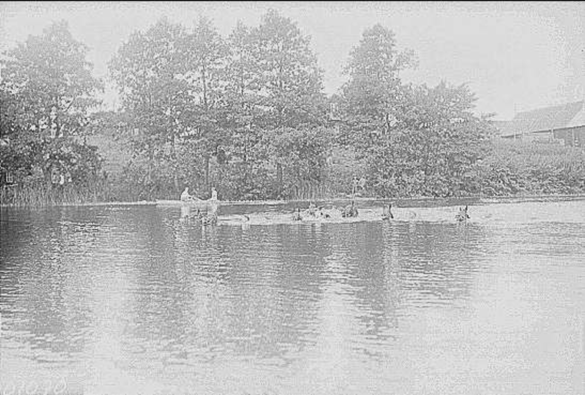 Patrullfälttävlan till häst 1934, simning med häst över vattendrag har påbörjats av patrullen. Livräddningsbåten till vänster i bild.