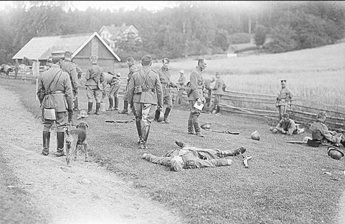 Patrullfälttävlan till häst 1934, mål för terränglöpningen. Livskvadronpatrull med löjtnant Sven von Essen med hunden Grace m.fl.