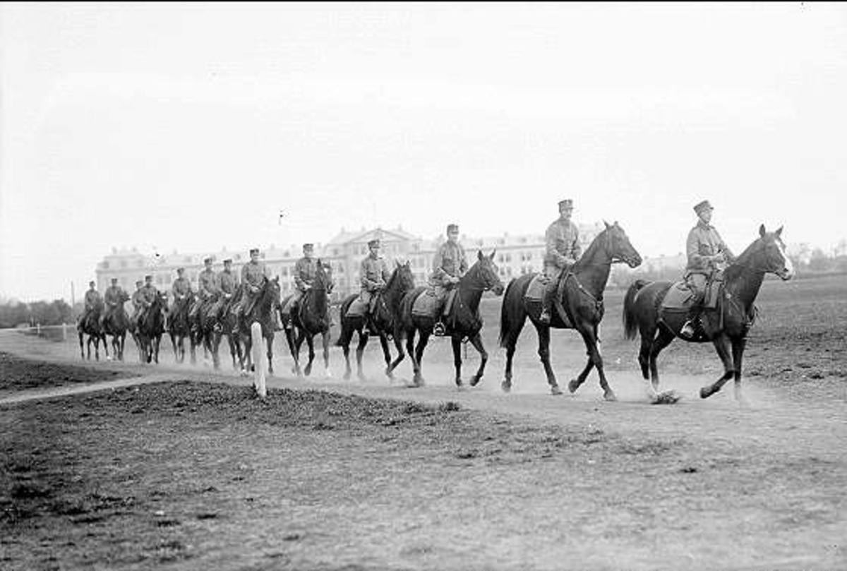 Avdelningsridning på fältet söder om kasern på väg mot Källedalsbäcken.