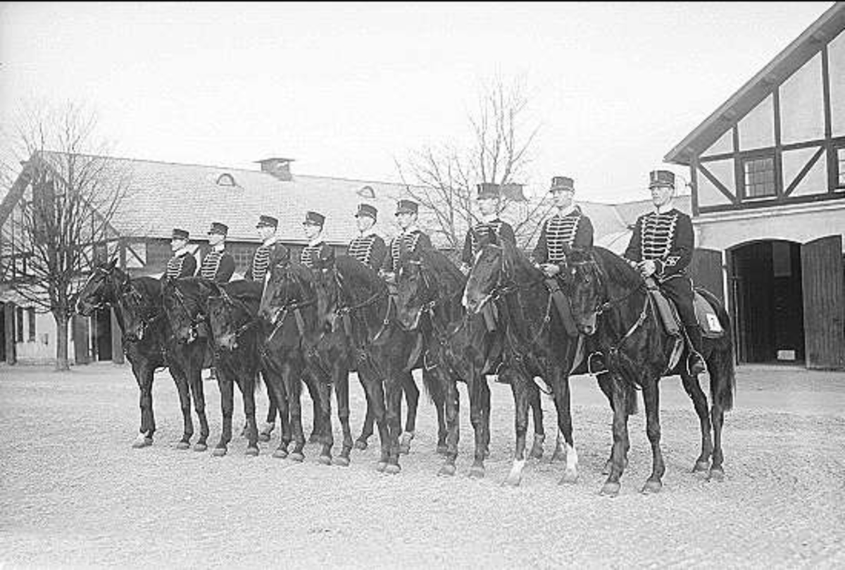 En skvadrons stamskola till häst utanför stallet före avlämning, antagligen för inspektion pga nummerlappar på hästfilten.
