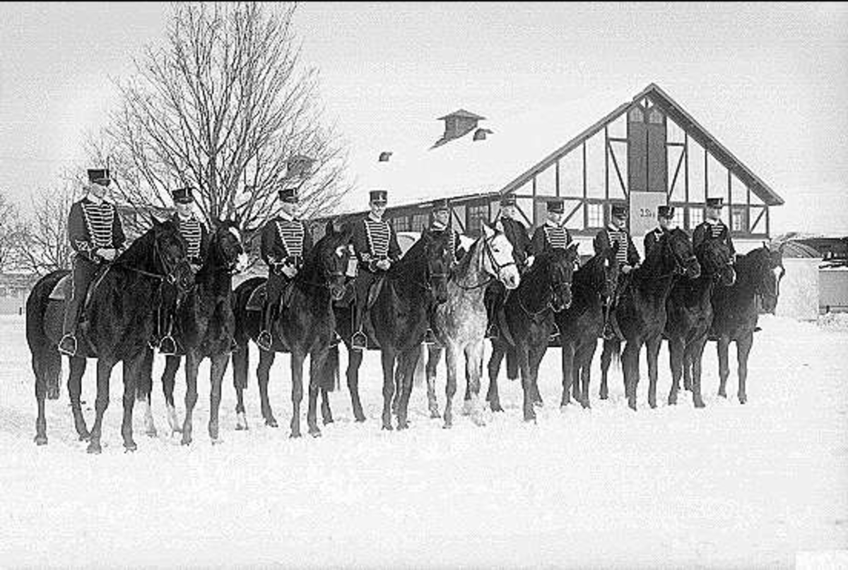 En skvadrons stamrekrytskola, skolchef underlöjtnant Melcher Wernstedt, uppställda på östra kaserngården snett framför Klockstallet. Femte från höger skolchefen, fjärde från höger skolchefens ställföreträdare (tvåstreckad furir).