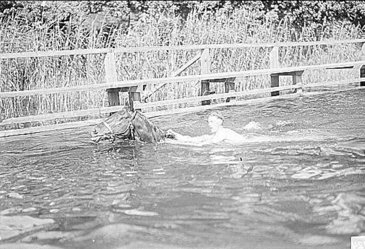 Titel: Vid bryggan i Sjötorpssjön tränades först svämning av hästar - hästen simmade och ryttaren ledde den gående på bryggan - därefter simning med häst längs bryggan. Därefter var det klart för simning med häst ute i sjön.