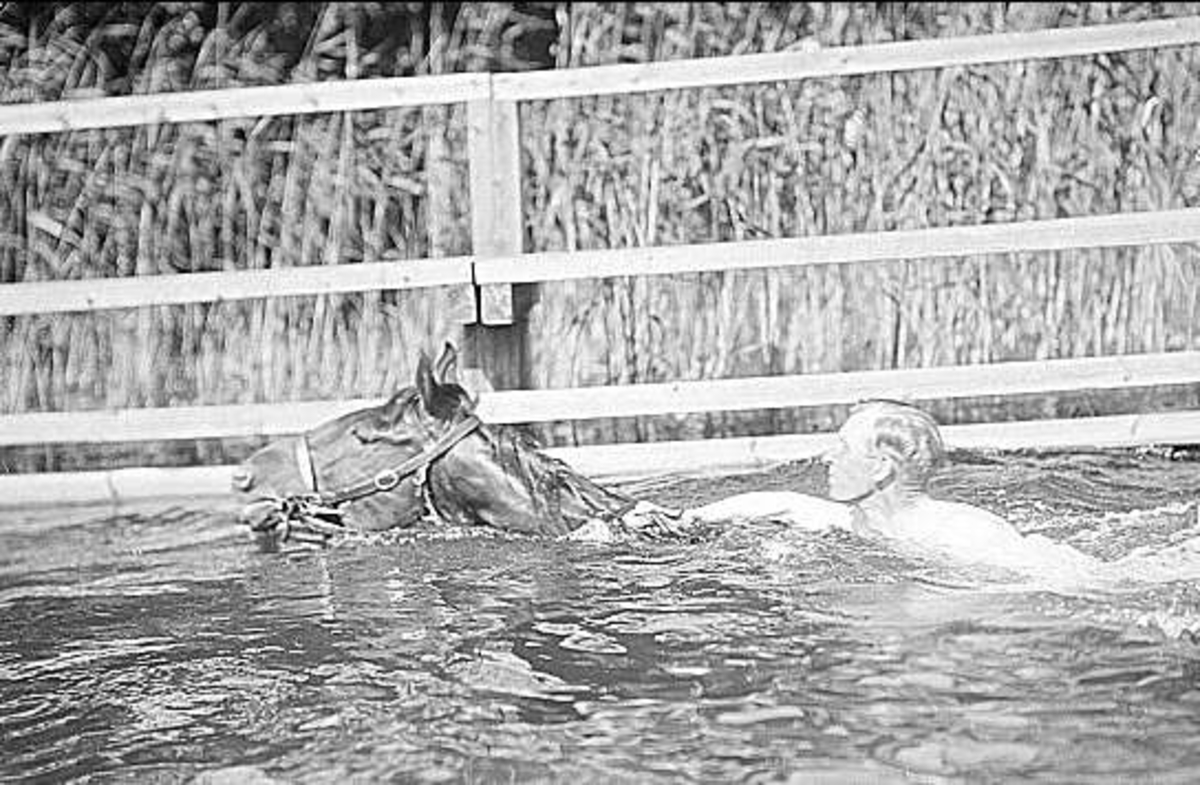Vid bryggan i Sjötorpssjön tränades först svämning av hästar - hästen simmade och ryttaren ledde den gående på bryggan - därefter simning med häst längs bryggan. Därefter var det klart för simning med häst ute i sjön.