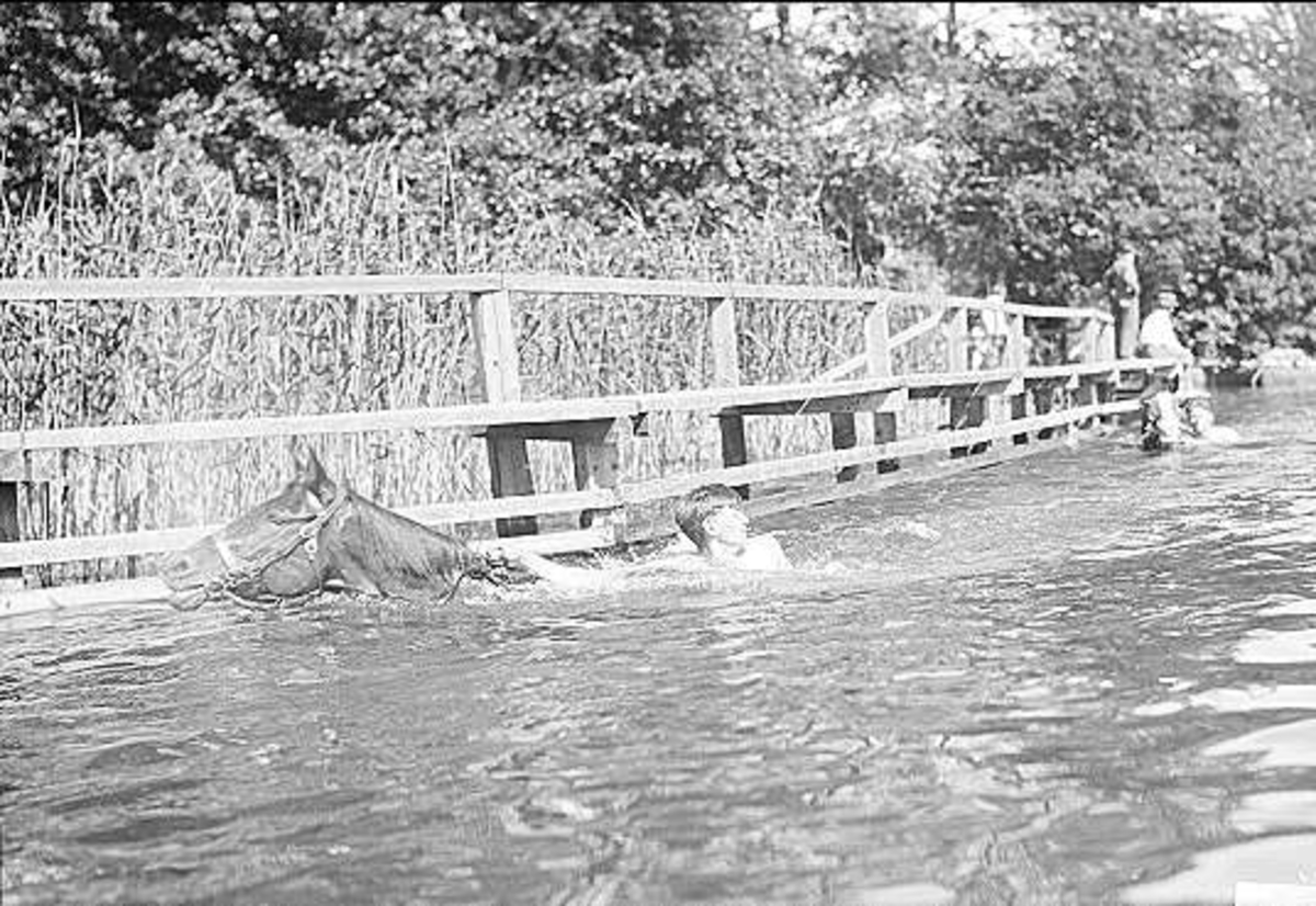 Titel: Vid bryggan i Sjötorpssjön tränades först svämning av hästar - hästen simmade och ryttaren ledde den gående på bryggan - därefter simning med häst längs bryggan. Därefter var det klart för simning med häst ute i sjön.