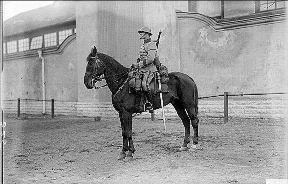 Fältutrustad livhusar till häst utanför skvadronsstallets östra långsida.