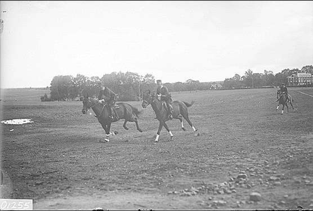 Regementskapplöpningar på övningsfältet söder K 3 kasern. På kapplöpningsbanans södra del. I bakgrunden till höger kungshuset - I 9 (P 4) regementschefsbostad.