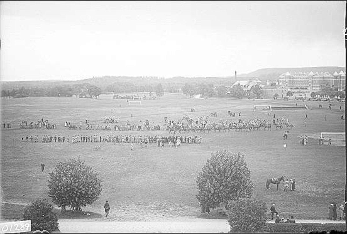 Regementskapplöpningarna 1932 på fältet söder K 3 kasern. Vy från kasernens tak söderut över kapplöpningsbanans västra del (målplatsen).