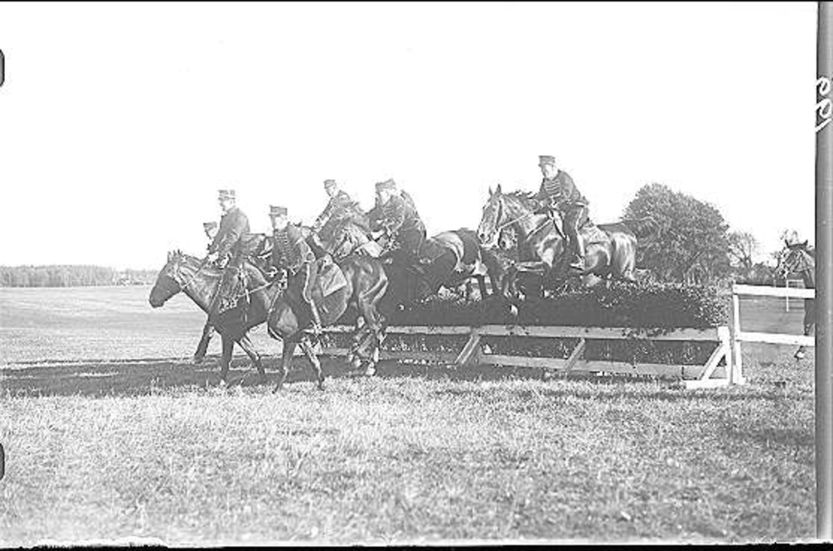 Regementskapplöpningarna 1933 på fältet söder K 3 kasern. Trängsel över häcken. Här är det svårt att hålla hästarna bakom mastern.