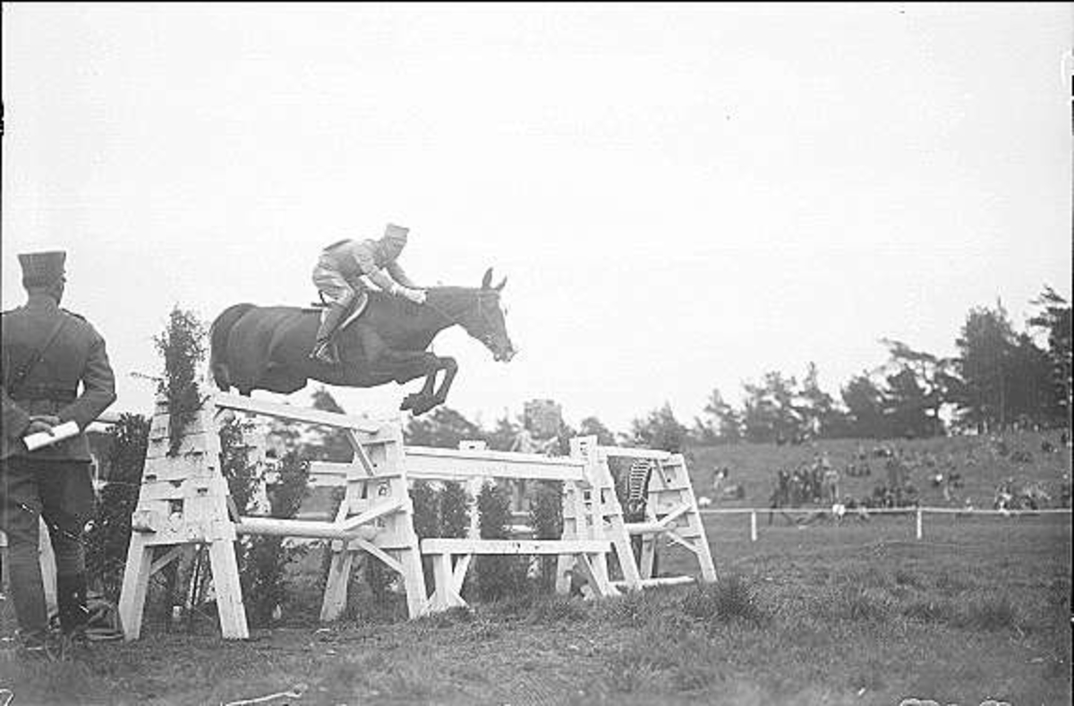 Skövde fältrittklubbs tävlingar 1934 på prishoppningsbanan öster om kasern. I bakgrunden Dunkehallsåsen.
