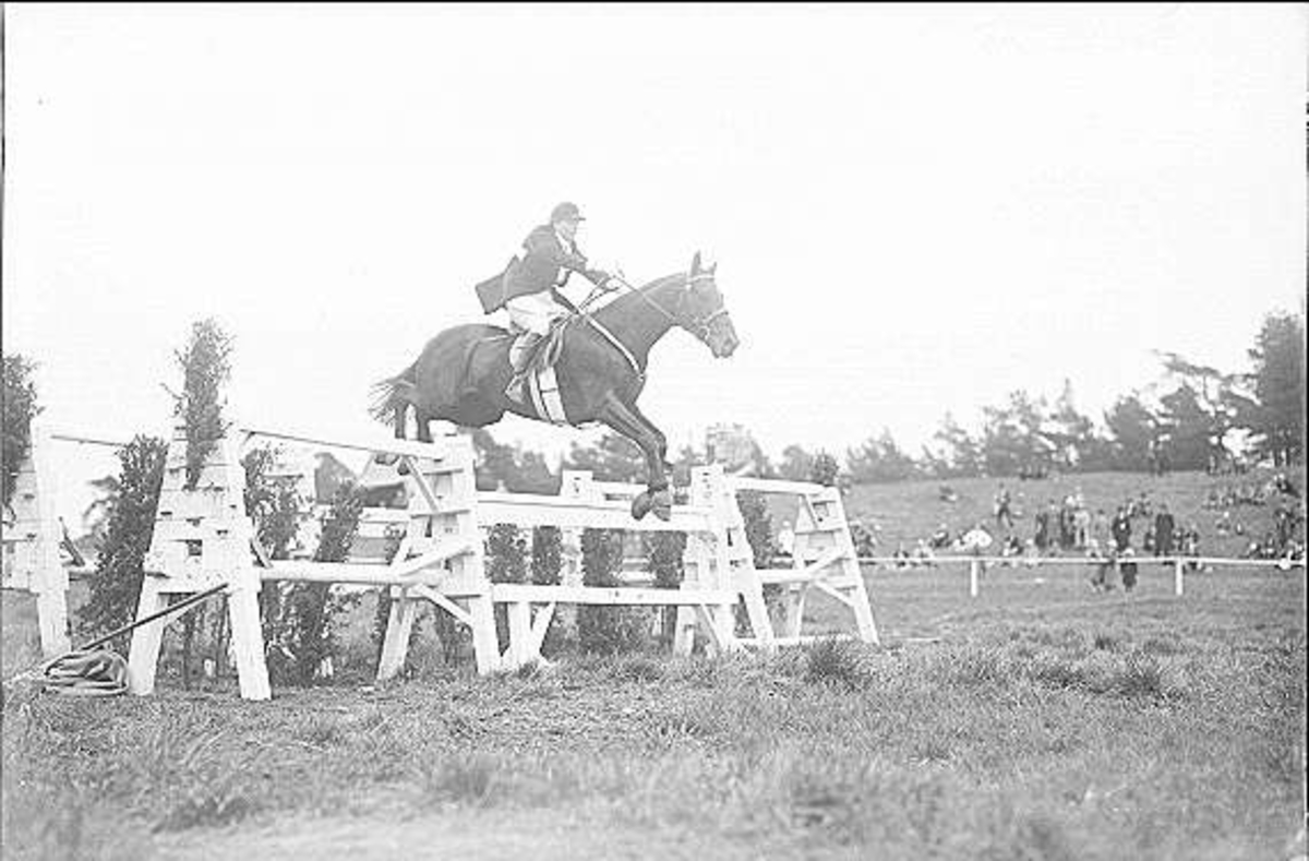 Skövde fältrittklubbs tävlingar 1934 på prishoppningsbanan öster om kasern. I bakgrunden Dunkehallsåsen.