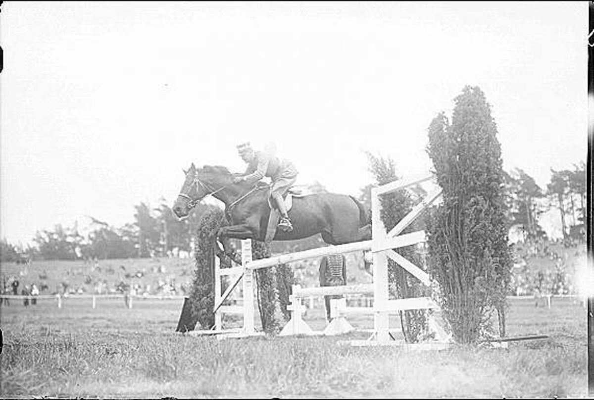 Skövde fältrittklubbs tävlingar 1934 på prishoppningsbanan öster om kasern. I bakgrunden Dunkehallsåsen.