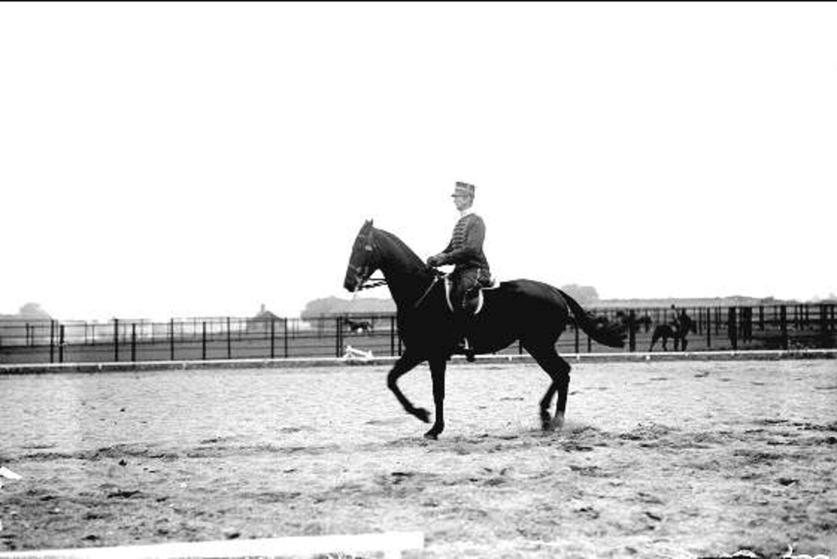 Rolf Örn på planen öster ridhuset under dressyrarbete med en av sina prishoppning - tävlingshästar. I bakgrunden järnpaddocken.