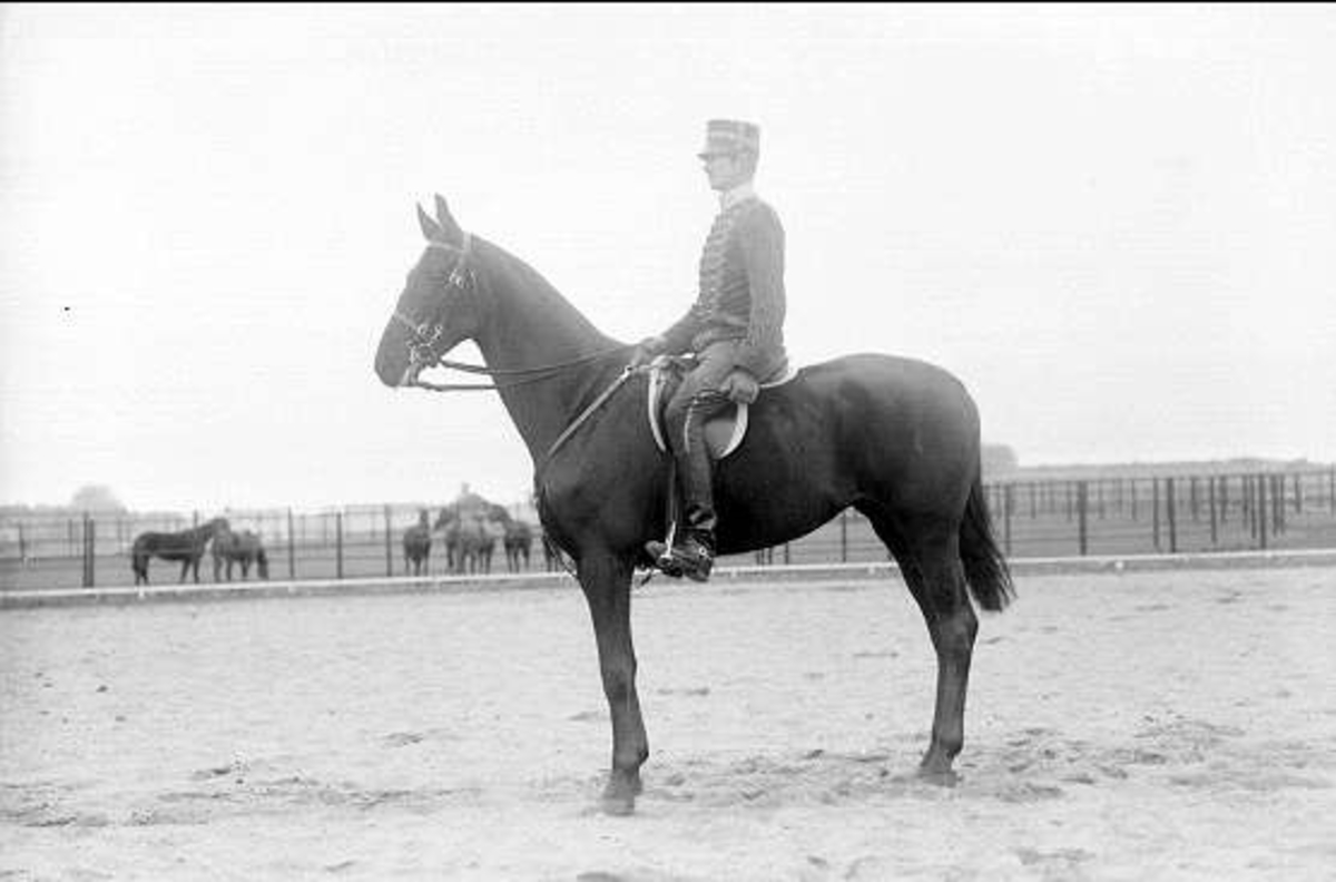 Rolf Örn på planen öster ridhuset under dressyrarbete med en av sina prishoppnings- tävlingshästar. I bakgrunden järnpaddocken.