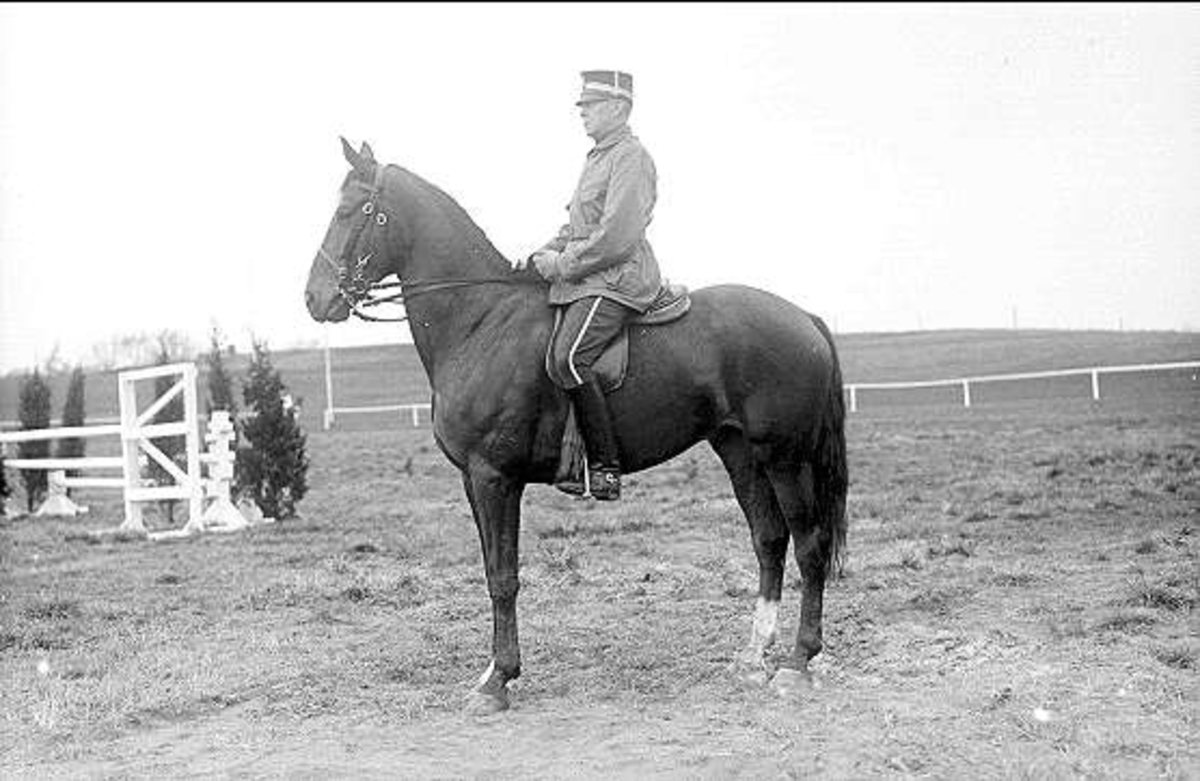 Sekundchefen överste Carl E Knös inspekterar prishoppningsbanan före Livregementets husares officerskårs sportförenings (LHOS) tävlingar 1934.