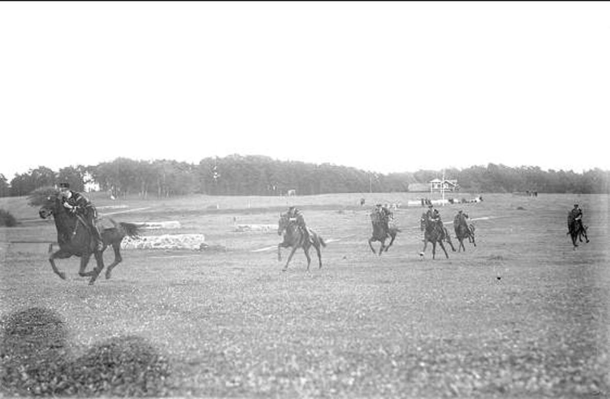 Regementskapplöpningar på fältet söder K 3 kasern. Jaktlopp för korpraler. Mastern har släppt fältet och upploppet har börjat.
