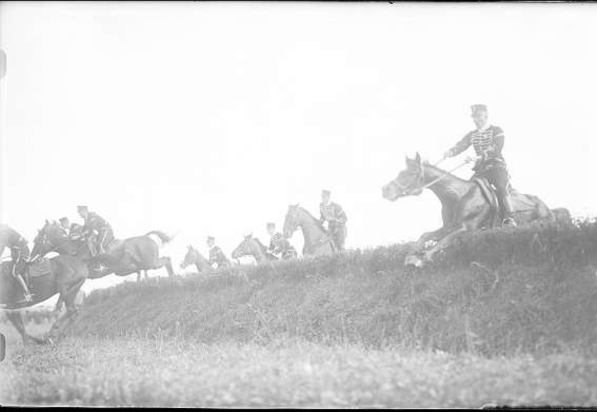 Regementskapplöpningar på fältet söder K 3 kasern. Jaktlopp för furirer passerar just över jordvallen öster I 9 kasernvakt. Närmast kameran furir Ragnar Seipel, senare fanjunkare K 3.