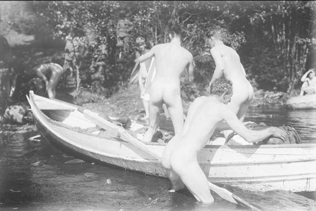 Övergång av vattendrag - simning med häst. Patrullens båt fylls med personalens och hästarnas utrustning.