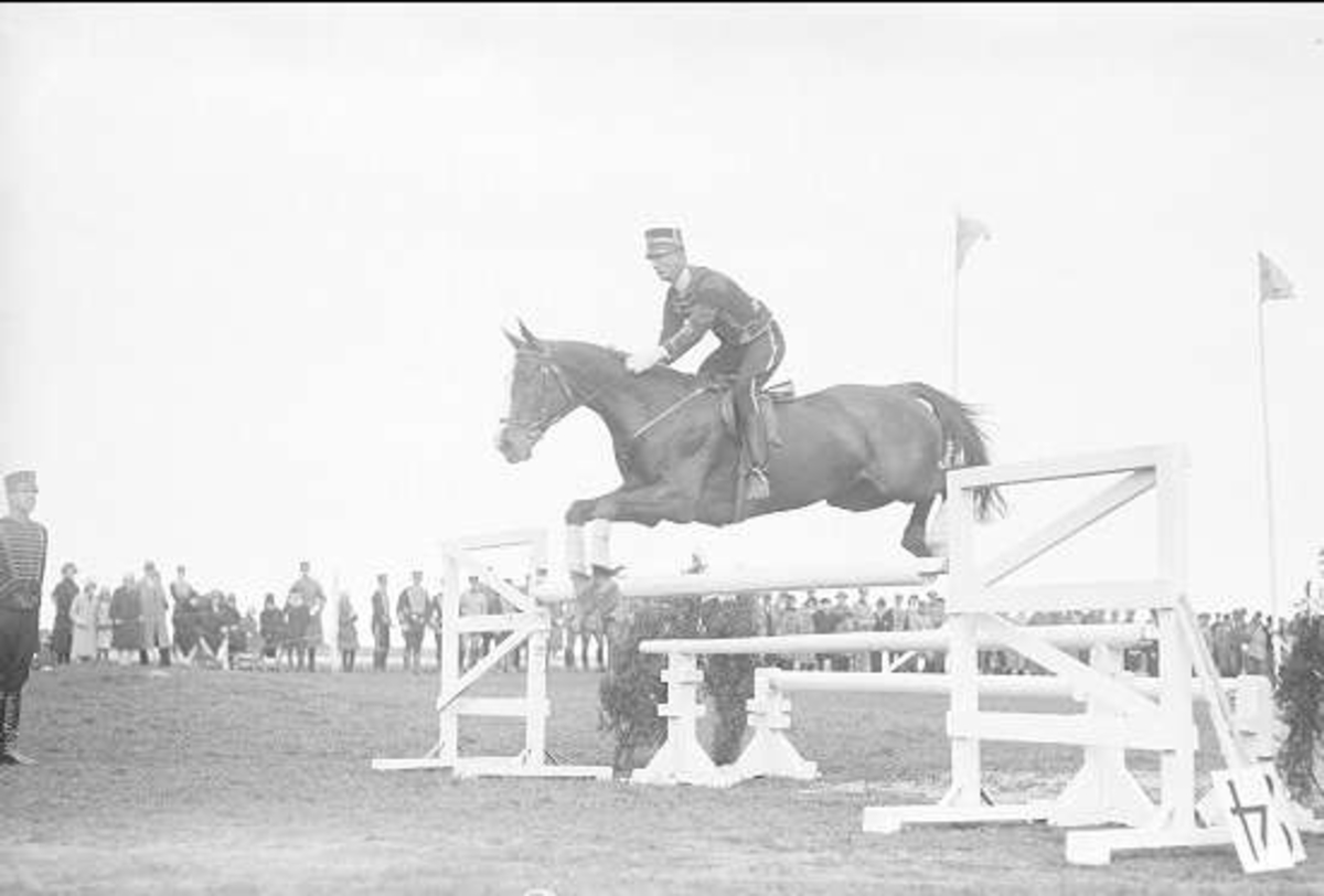 SFK:s vårtävlingar på prishoppningsbanan öster K 3 kasern. Rolf Örn - en av 30 - talets främsta prishoppningsryttare - på Cecil efter David - Rapid Water.