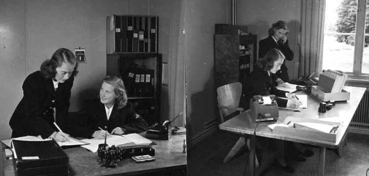 F6 Karlsborg 1948. Flyglottorna från vänster Wahren och Greiffe som kontors och kanslibiträden. Albumet är en del av en donation från Karl-Axel Hansson, Karlsborg. Förteckning över hela donationen finns i albumet samt som Word-dokument.