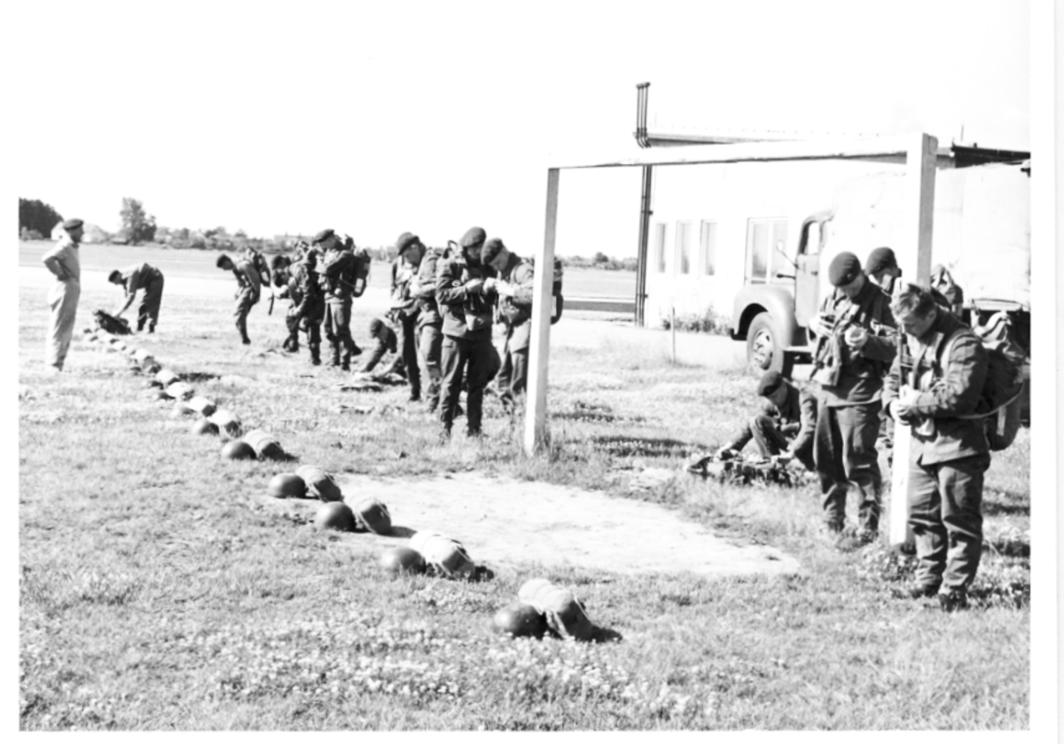 Fallskärmsjägarskolan Karlsborg i början av 1960-tal. Förberedelser inför fallskärmshoppning.