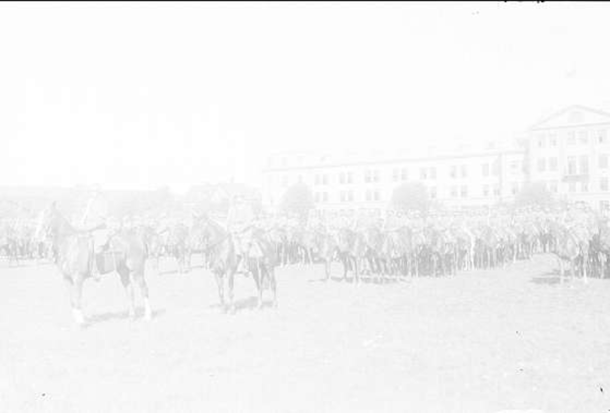 Regementsmötet 1931. Fältgudstjänst till häst på fältet söder om K 3 kasern vid kamratföreningens besök. Närmast kameran 4. skvadronen, chef ryttmästare Rolf Örn på Cécil** efter Druid. Adjutant fanjunkare Eskil Björk på Dragon efter Snällman.