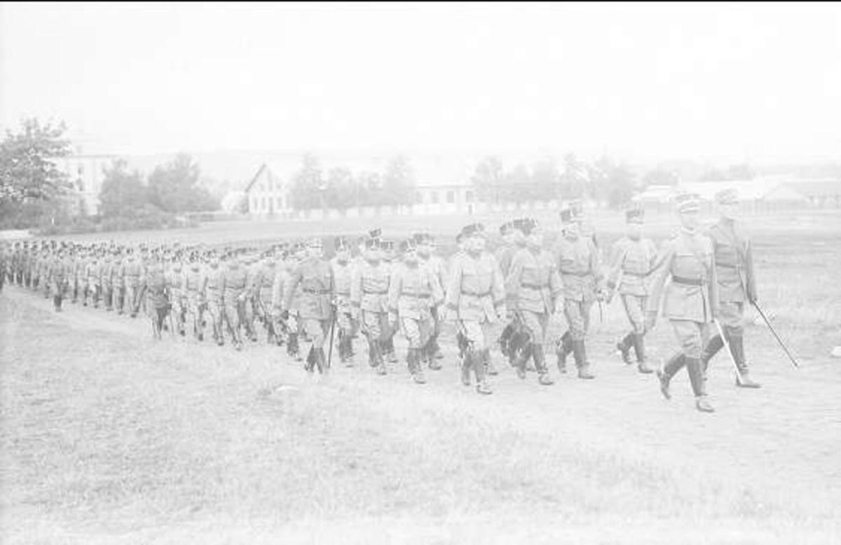 På marsch från kasern till fältgudstjänst i Dunkehall. Soldaterna iklädda uniform m/1910 och mössa m/ä.