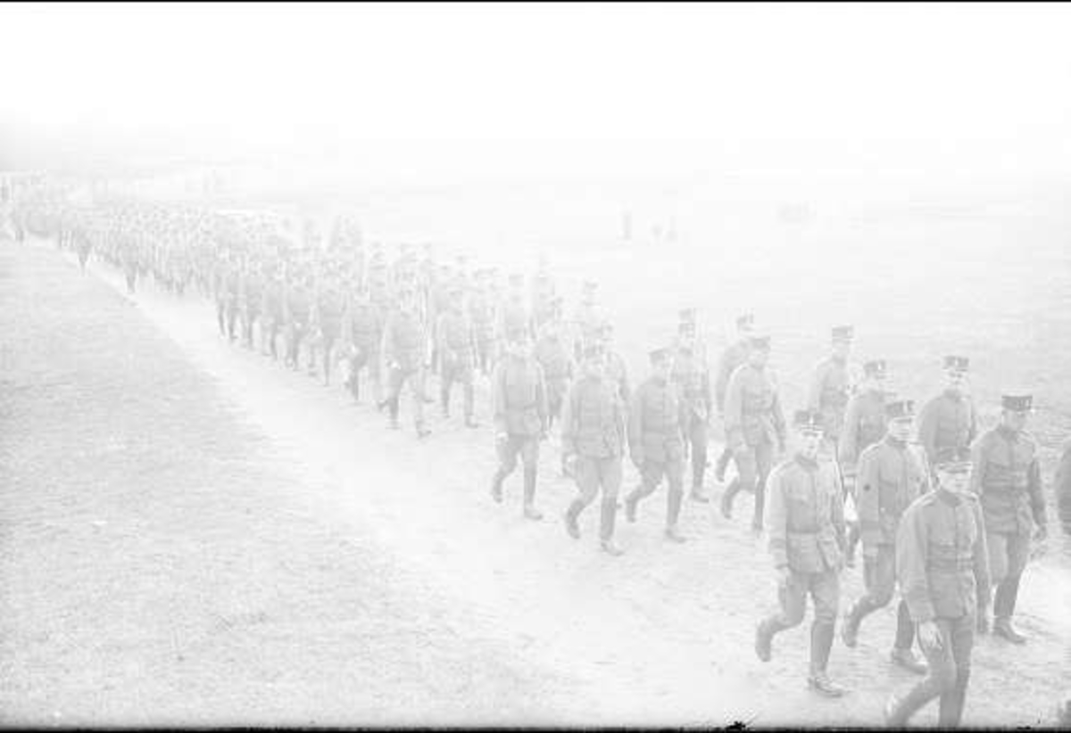 På marsch från kasern till fältgudstjänst i Dunkehall. Soldaterna iklädda uniform m/1910 och mössa m/ä.