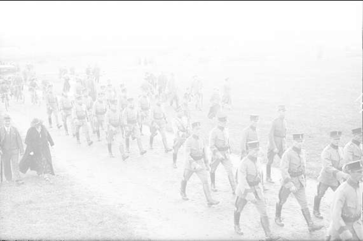 På marsch från kasern till fältgudstjänst i Dunkehall. Soldaterna iklädda uniform m/1910 och mössa m/ä.
