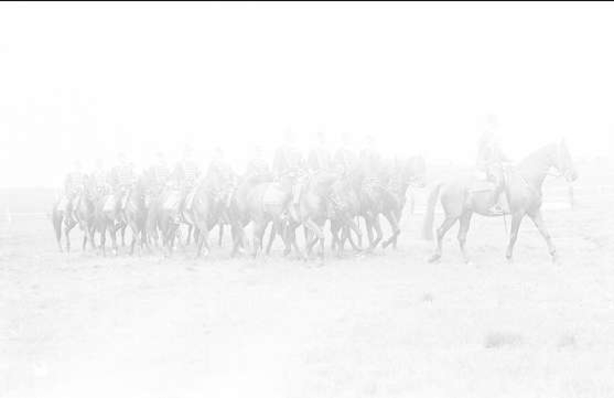 Titel: Kadrilj vid SFK:s vårtävlingar 1934 under ledning av löjtn. C J Wachtmeister. Deltagare musikkåren under musikfanj. C A Borgmans ledning samt 16 underbefäl vid regementet. Bilderna tagna delvis på kaserngården och delvis på prishoppningsbanan.
