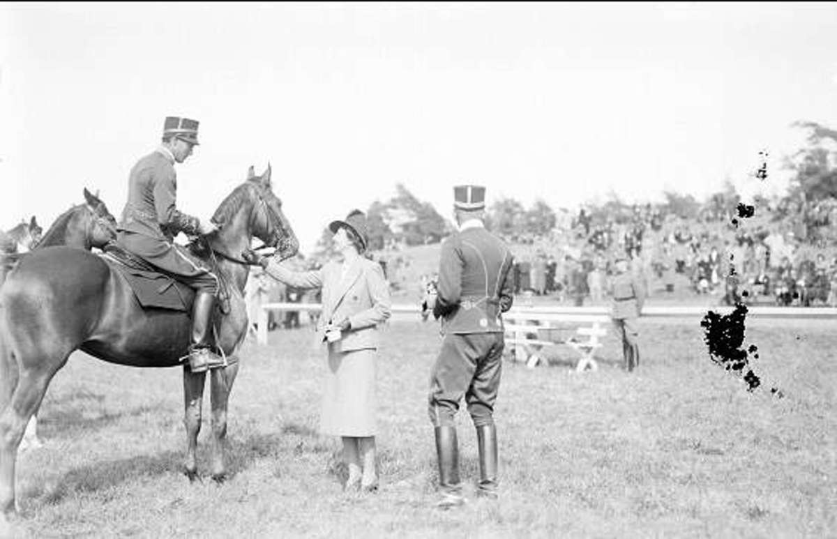 Löjtnant Gunnar Bernström tar emot pris av generalskan Tyra af Edholm. Med ryggen mot kameran ryttm. K 3 Peter von Essen.