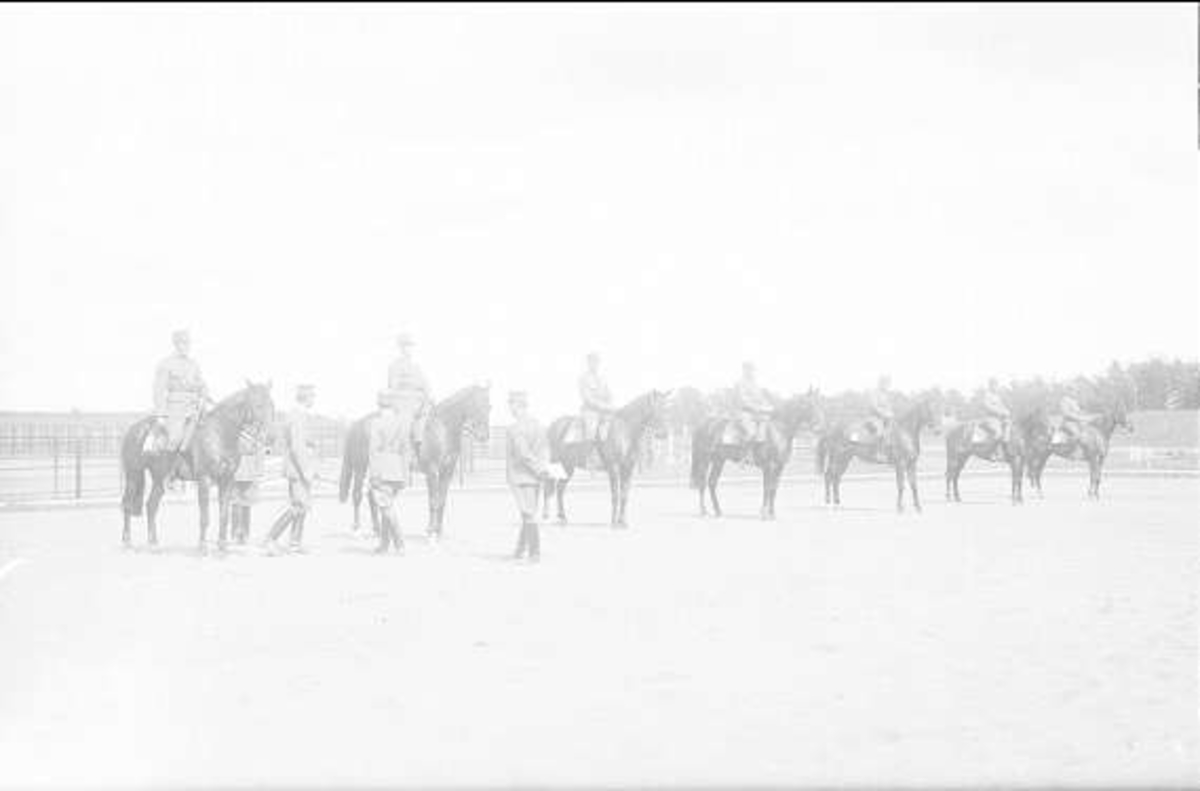 Inspektion av general G. Gyllenstierna. Till fots från vänster: kavalleriinspektören general G. Gyllenstierna, stabschefen vid kav.inspektionen överstelöjtnant Åke Hök, löjtnanten vid K 3 Stig Roempke.
