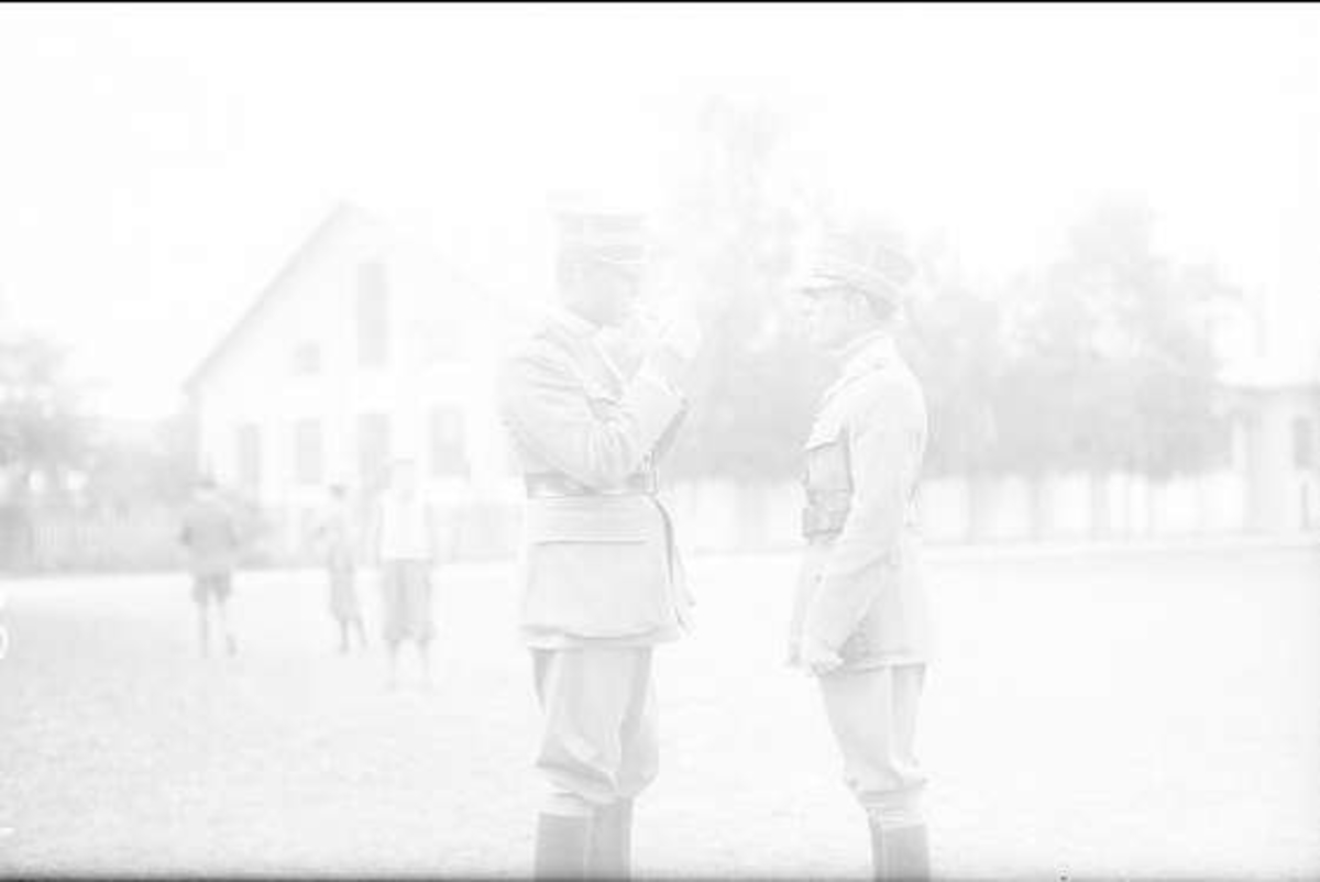 Kavalleriinspektören general Göran Gyllenstierna i samspråk med löjtnant Stig Roempke på K 3 kaserngård. I bakgrunden gymnastiksalen (Lundasalen).