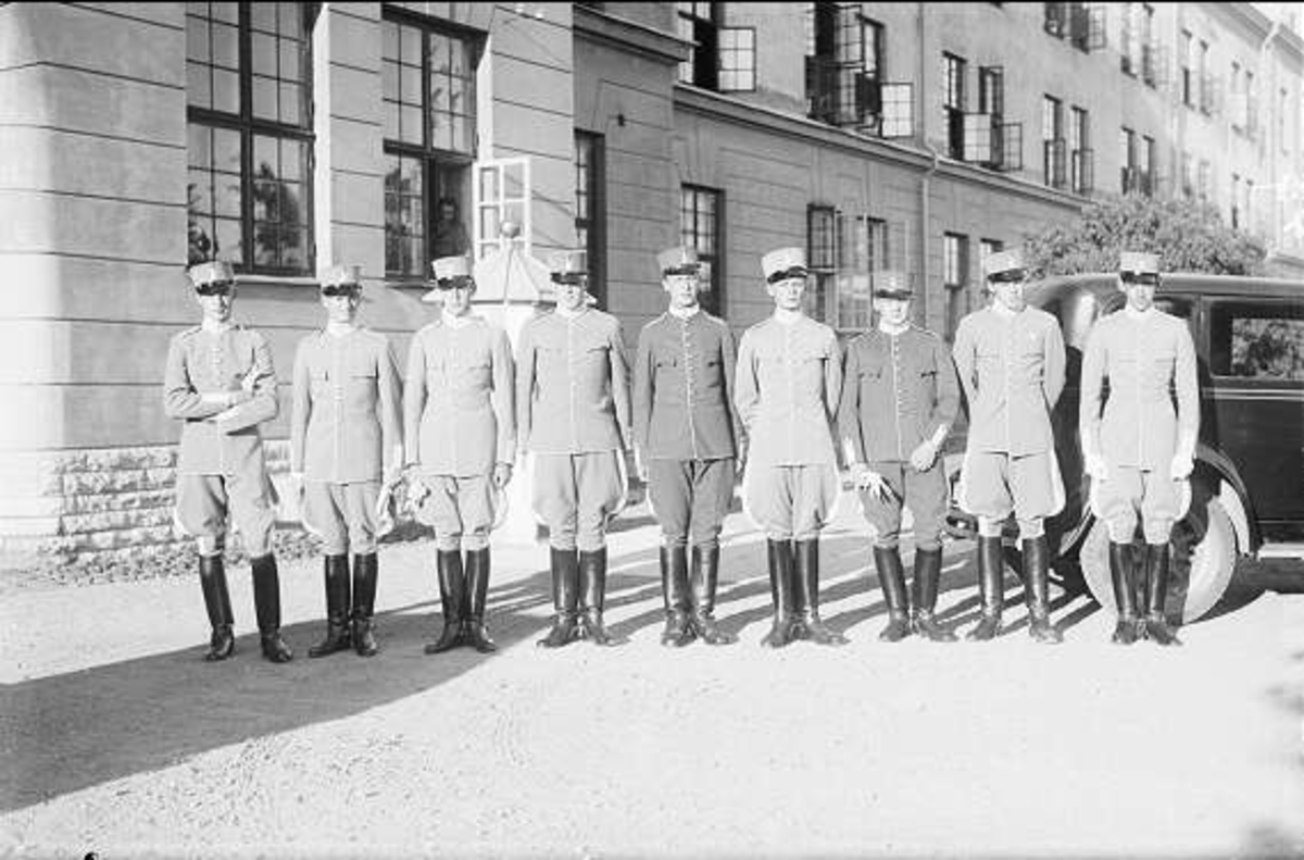 Nio aspiranter från K 1 utanför valvet K 3. Färgskiftningen i uniformerna beroende på olika tygkvalitet. De ljusa uniformerna är privata medan de två något mörkare är kronans uniformer. Färgskiftningen i verkligheten relativt liten. Gruppbild.