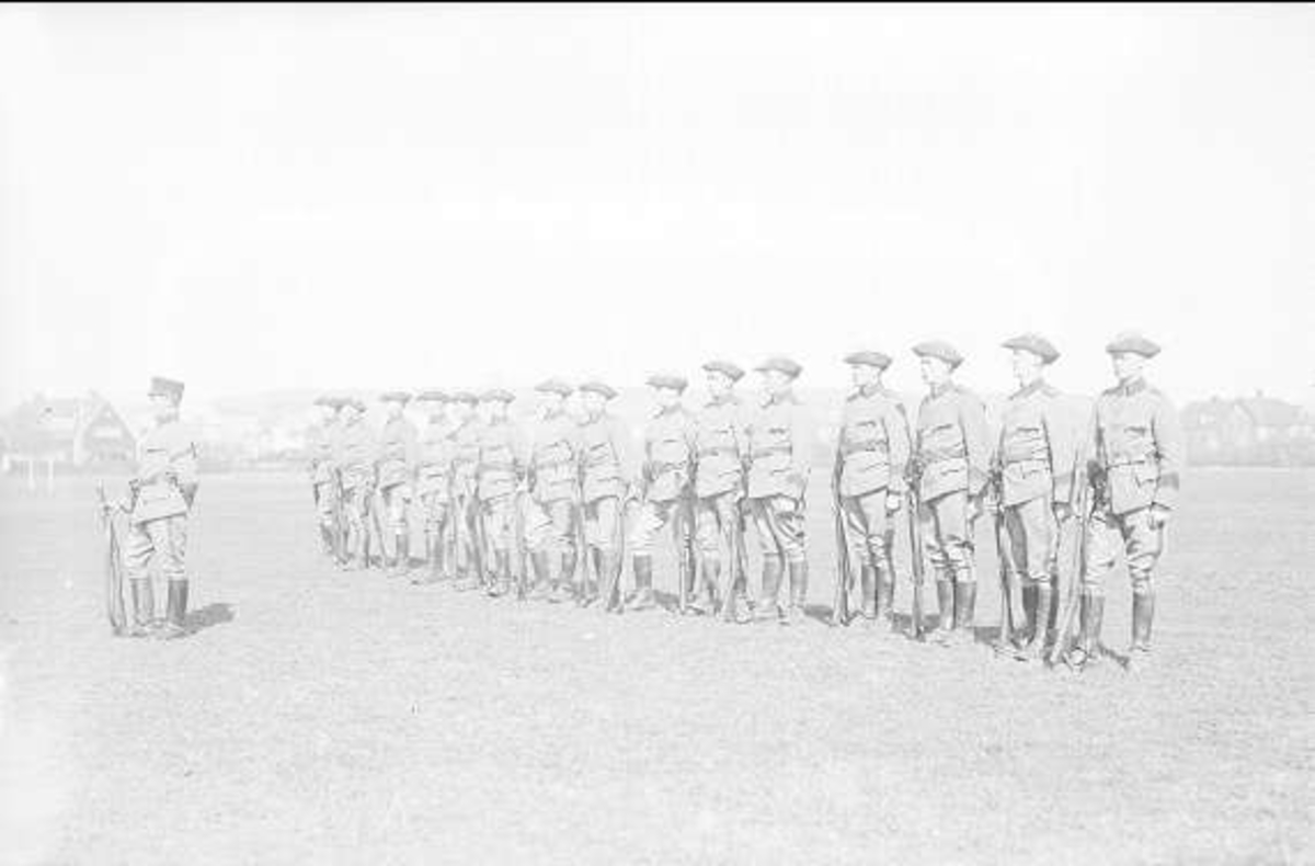 Vplavdelning under "lystring manöver", uppställd på fältet söder K 3 kasern. Uniform m/10. Avdelningschefen , tvåstreckad furir, dock mössa m/ä. I bakgrunden till vänster soldathemmet.