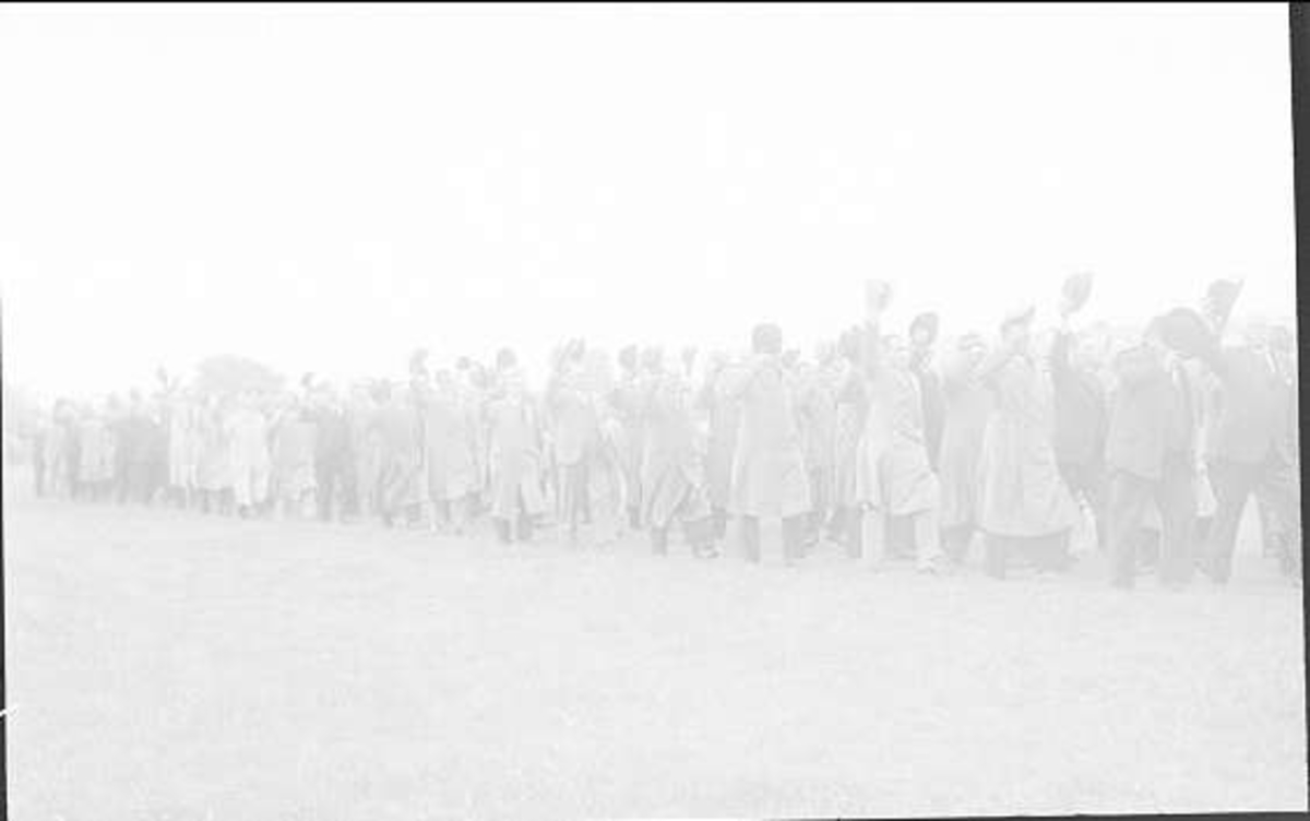 Deltagarna i kamratdagen 7 juni 1937 marscherar ut till uppställningsplatsen på fältet söder om kasern för att lämna av till sekundchefen. I bakgrunden den beridna musikkåren med vit pukhäst.