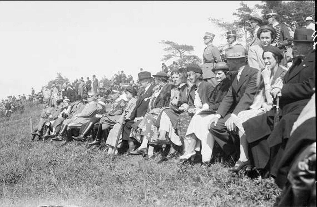 Åskådarna samlade på Dunkehallsåsens sluttning för att åse förevisningar av olika slag på prishoppningsbanan. Prins Eugen hedersöverste K 3, syns i främre raden något bortom mitten.