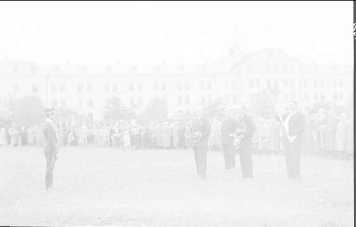 Avlämning - hälsning på fältet söder K 3 kasern. Västra kasernflygeln i bakgrunden till höger. Mitt i bild major W Odelberg med det standar han skänkt till Göteborgsavdelningen.