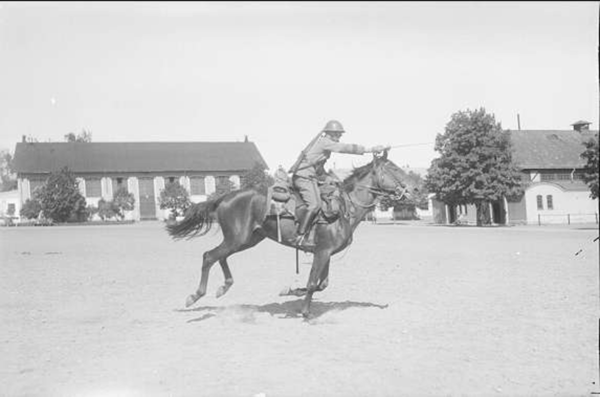 Titel: Sabelfäktning till häst på K 3 kaserngård. Ryttaren i uniform m/1910, hästen i full fältutrustning.