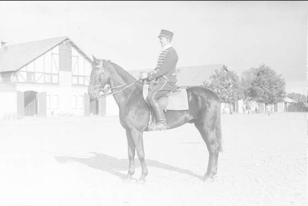Livhusar på tilldelad stamhäst utanför skvadronstallet.